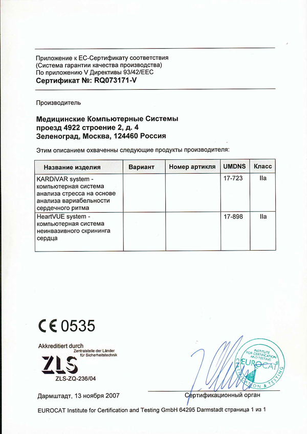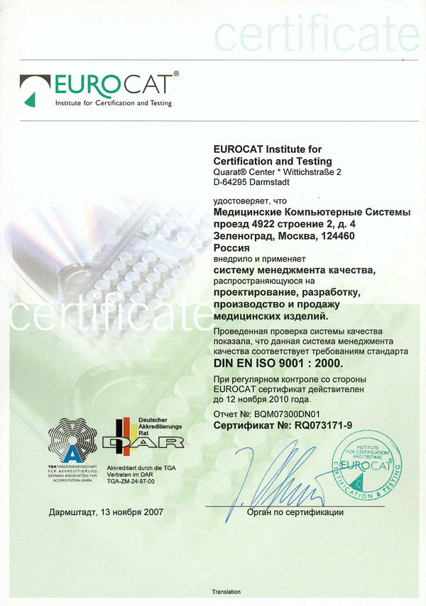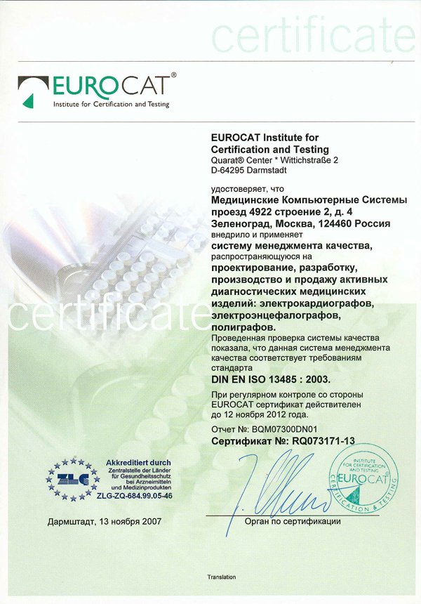 DIN EN ISO 13485:2003 (область сертификации – проектирование, разработка и продажа активных медицинских изделий: электрокардиографов, электроэнцефалографов, полиграфов),