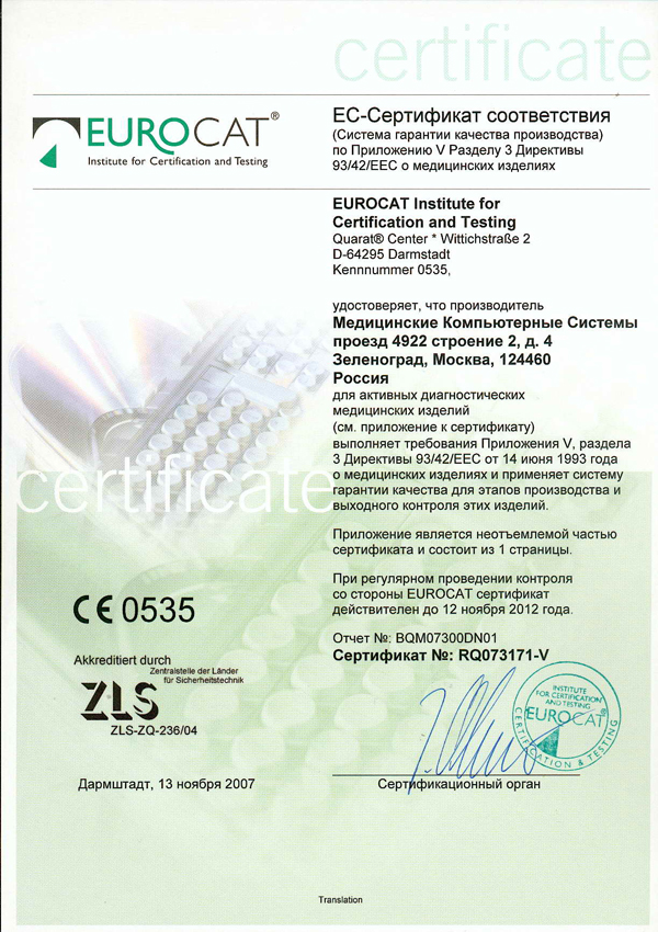 Все сертификаты выданы и поддерживаются на основании ежегодных аудитов, проведенных EUROCAT. EUROCAT "Institute for Certification and Testing GmbH" (Франкфурт, Германия) является институтом по проведению сертификационных испытаний медицинских изделий и программного обеспечения, а также по сертификации системы менеджмента качества в области здравоохранения и производства медицинских изделий. EUROCAT признан нотифицированным органом для медицинских изделий в Европе с номерным знаком CE 0535.