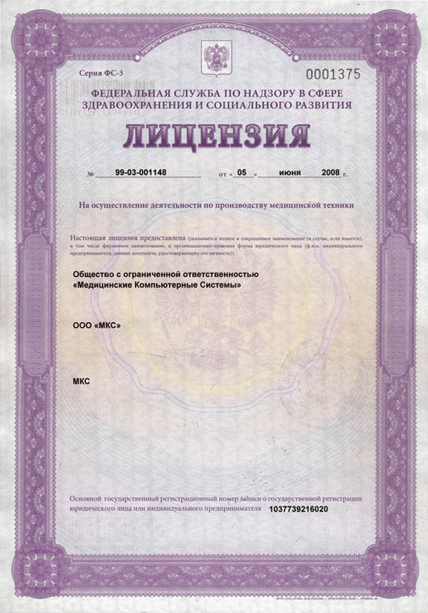 Лицензия на производство медицинской техники, выданная Федеральной службой по надзору в сфере здравоохранения и социального развития РФ.