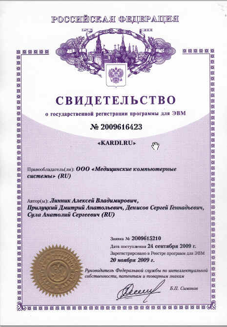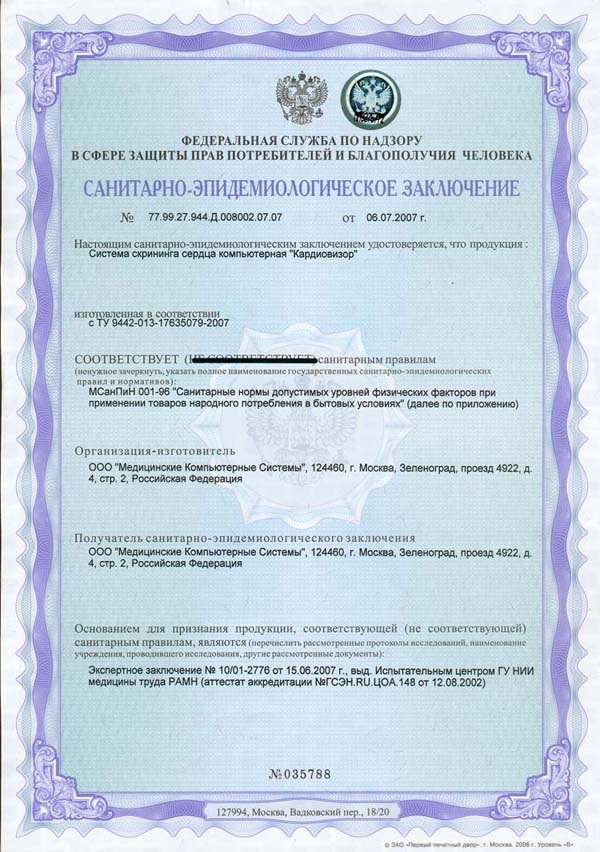 Регистрационное удостоверение на систему скрининга сердца компьютерную «Кардиовизор» и на систему Kardi.Ru