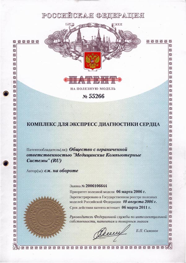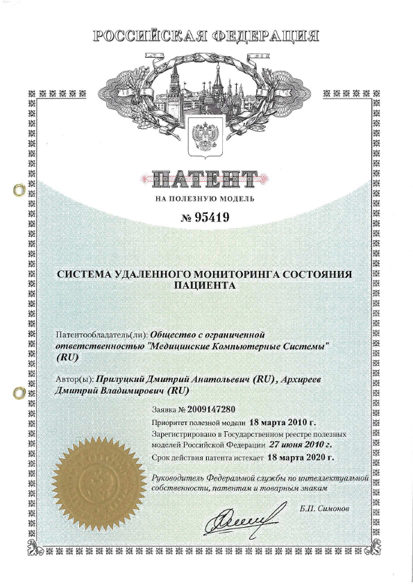 В Российской Федерации патентами защищены: система удаленного мониторинга состояния пациента, технология передачи обследования от пациента на сервер и от пациента к врачу, программное обеспечение для автоматического формирования заключения и торговая марка Кардиовизор.